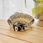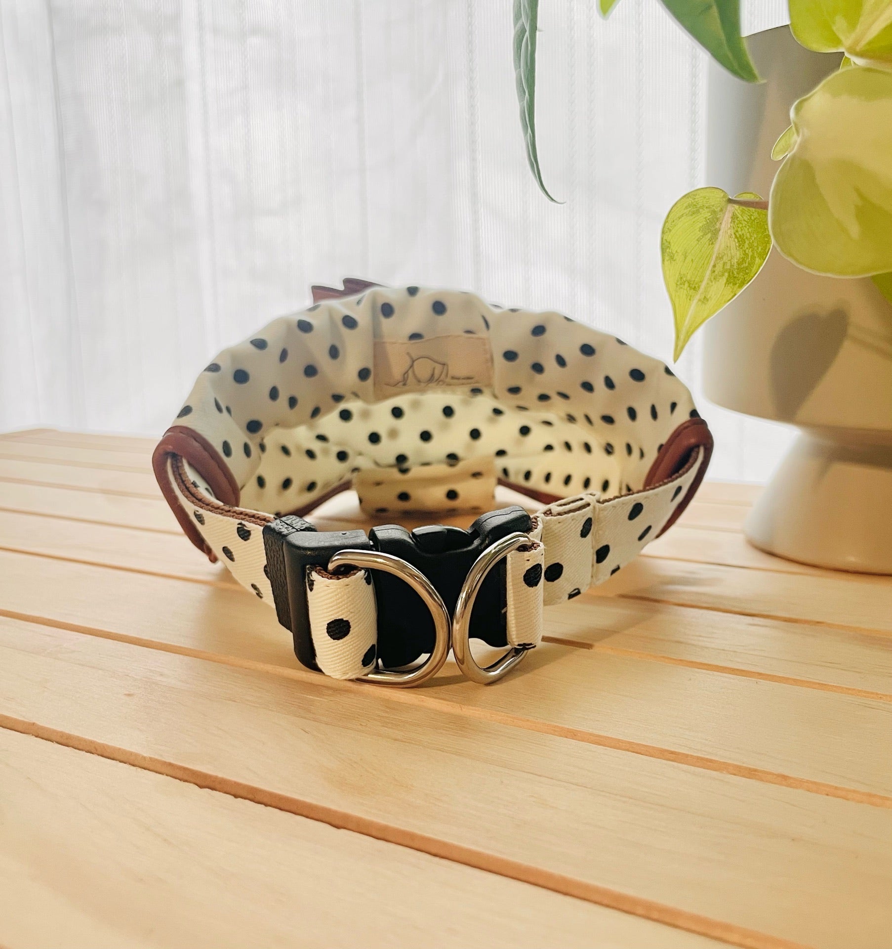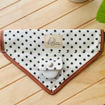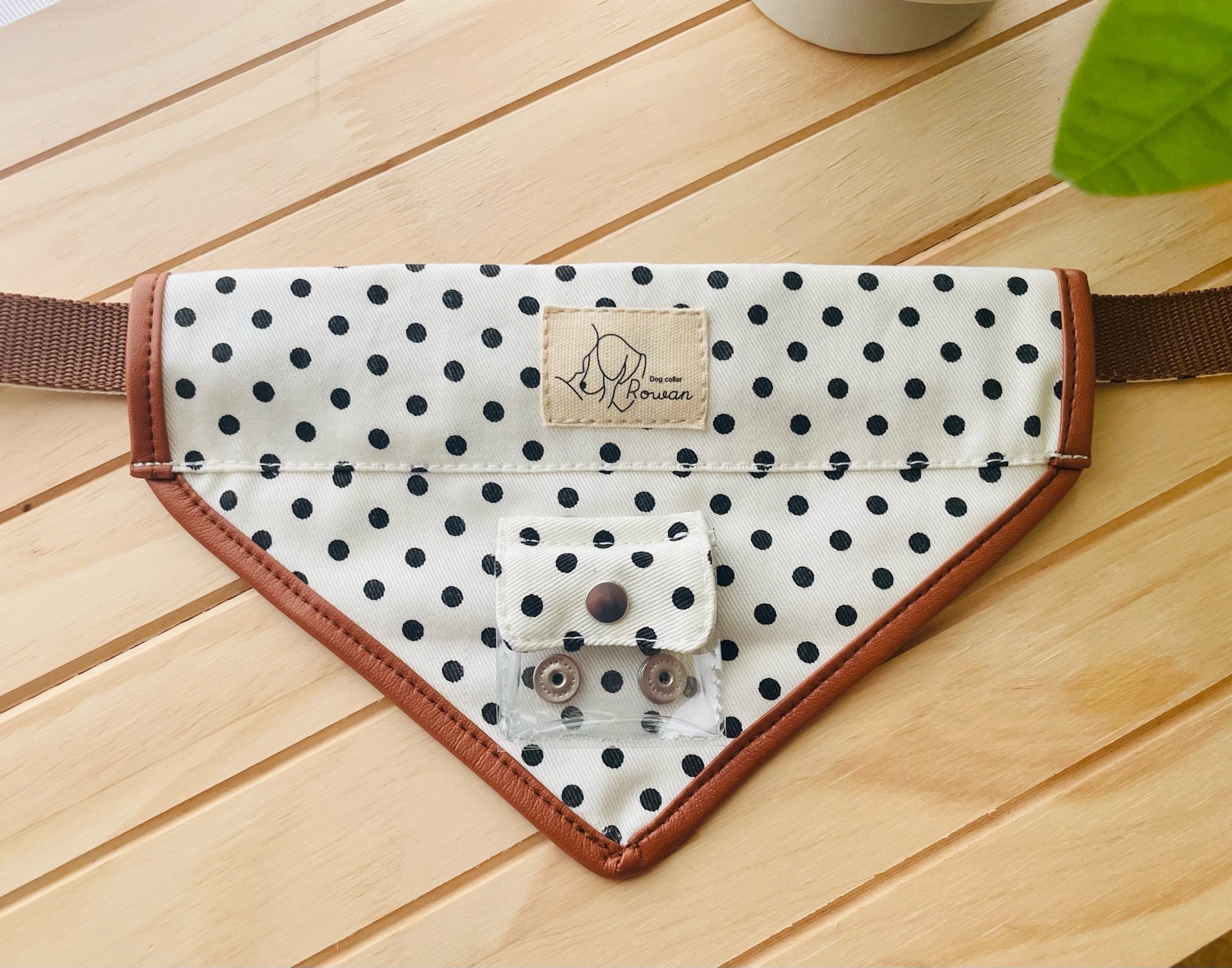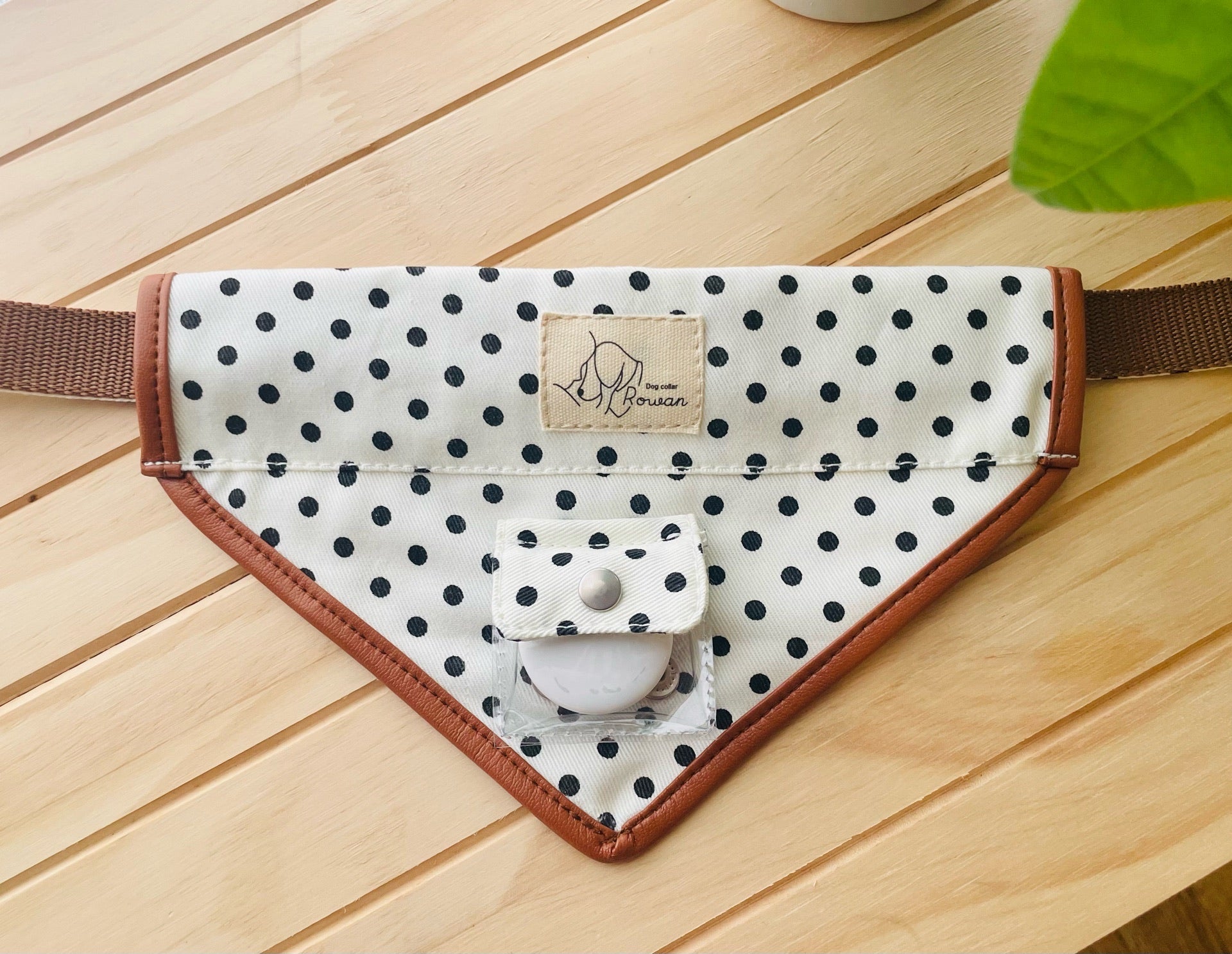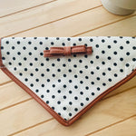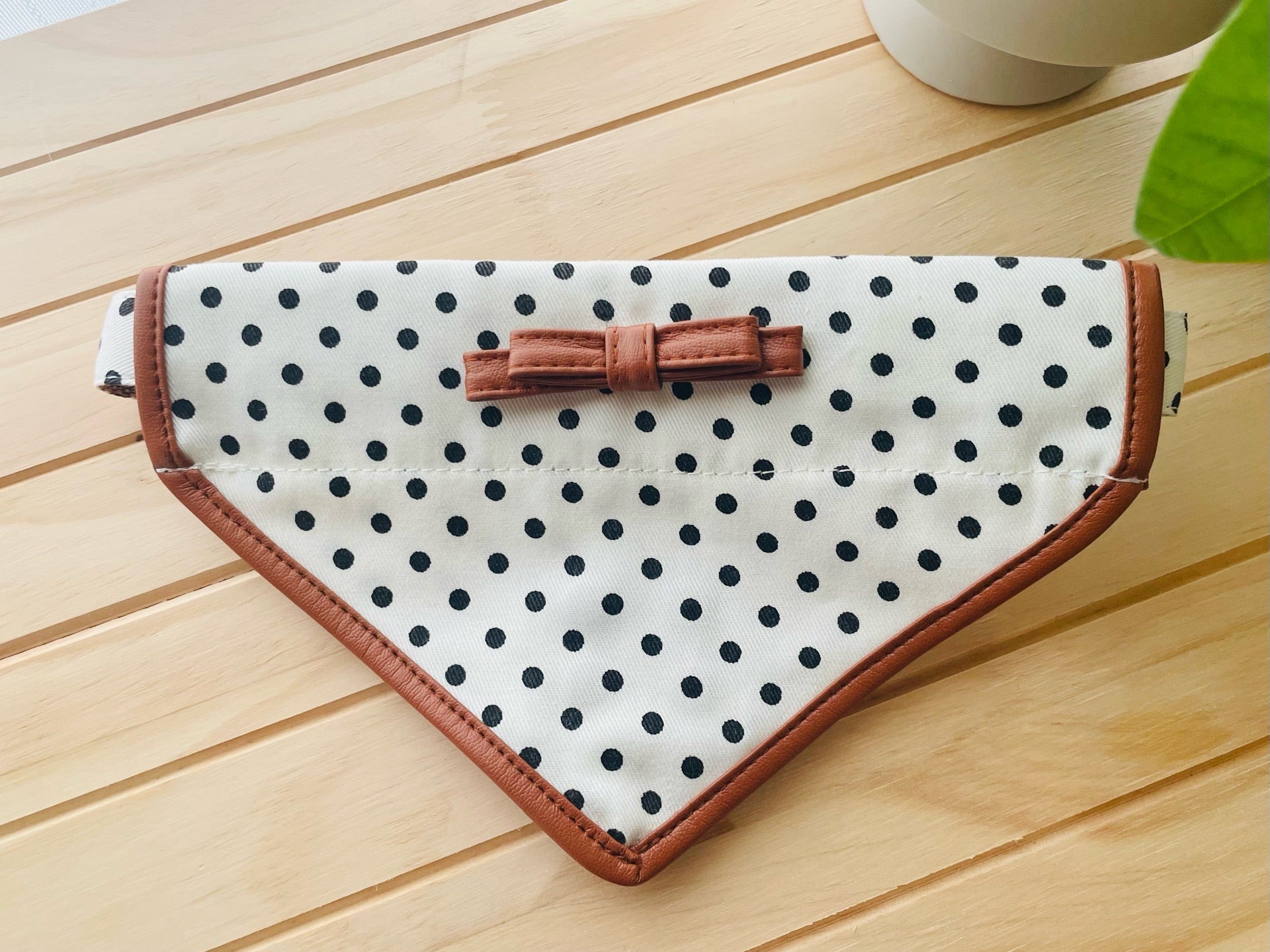 モノトーンカラーのドットに、エコレザーのリボンやパイピングがアクセントに。