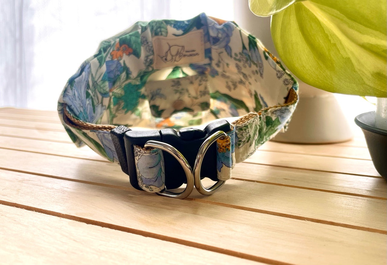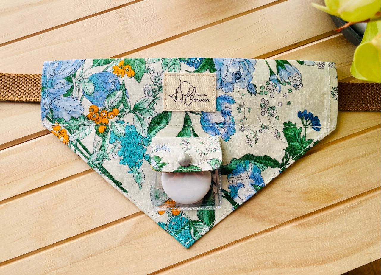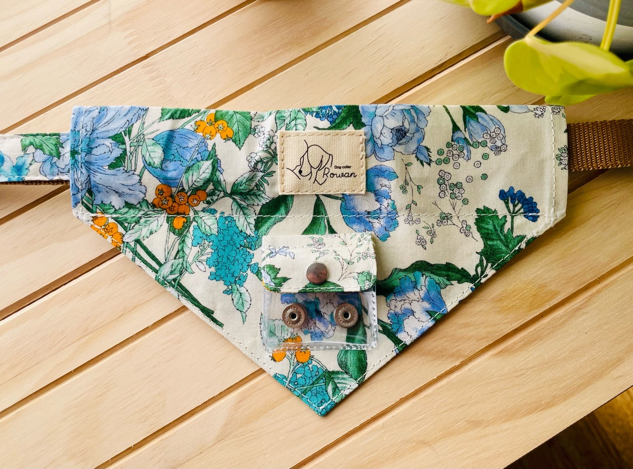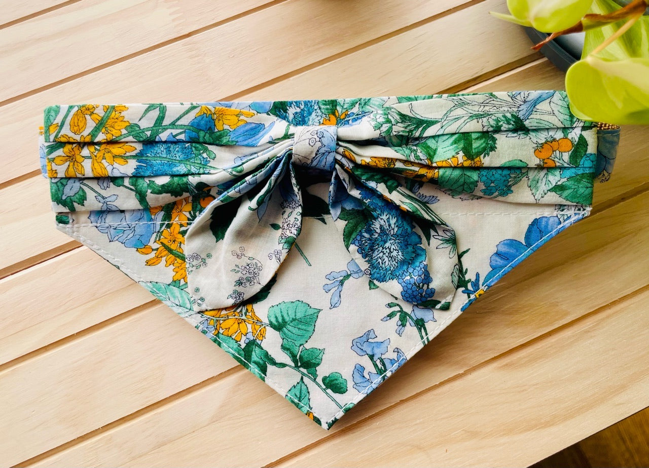 爽やかな花柄と、ギャザーリボンが目を惹くバンダナ首輪。
